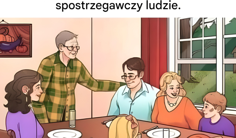 Ten rodzaj zagadki opiera się właśnie na naszej skłonności do wierzenia w to, co widzimy, bez patrzenia. Bo tak, czasami nasz mózg „uzupełnia luki”, nie zdając sobie z tego sprawy. Obraz przedstawia nam typową scenę : dorośli i dzieci zebrani w jadalni, wyraźnie gotowi na smaczny posiłek. Starszy mężczyzna stoi, być może wypowiadając kilka słów, zanim zasiądzie do posiłku.