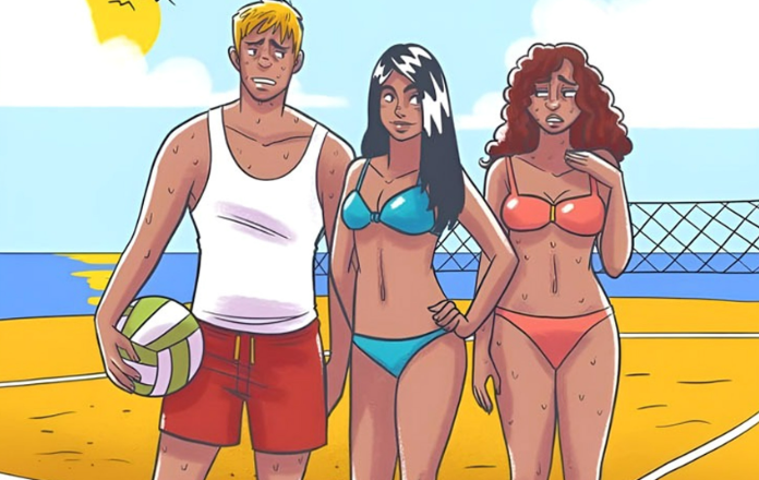 Trzy osoby spokojnie wygrzewają się na plaży. Z pozoru zwyczajna scena.
