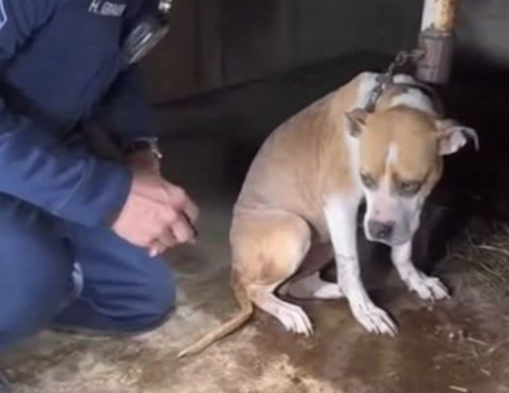 Brady uklęknął obok niego i szepnął cicho przez łzy: „Już po wszystkim, kolego”. Przeciął łańcuch, owinął wątłego psa swoją kurtką i wyniósł go na światło — wreszcie wolnego.