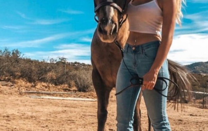 W spokojnej, wiejskiej scenerii Emily pozowała ze swoim ukochanym koniem, gdy popołudniowe światło delikatnie oświetlało pola.
