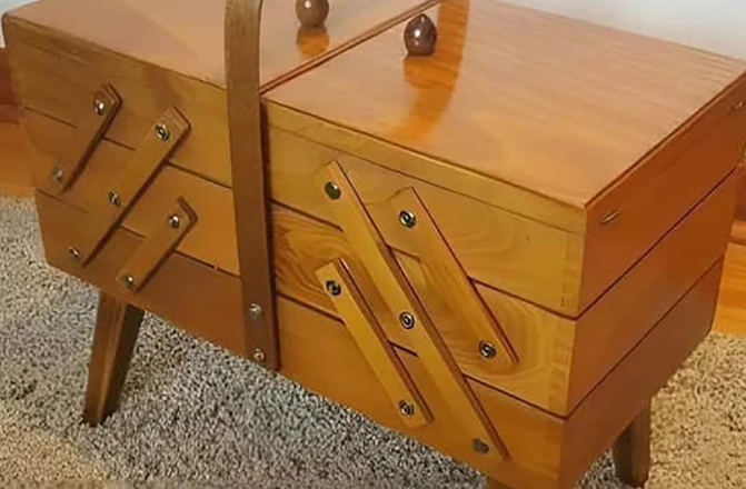 To, co widzisz przed sobą, to autentyczne składane pudełko na przybory do szycia , często wykonane z lakierowanego drewna, niekiedy pięknie rzeźbione. Prawdziwy niezbędnik w domach z połowy XX wieku, nieodzowne narzędzie dla pasjonatów szycia. Dzięki pomysłowym przegródkom, rozkładanym schodkowo, pozwalało na przechowywanie wszystkiego w porządku: szpulek, igieł, naparstków, nożyczek, guzików… prawdziwa skarbnica!