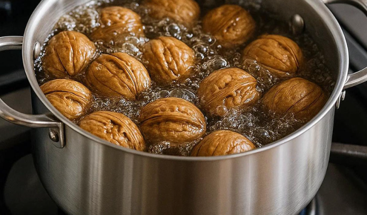 - Orzechy włoskie bez łupin wrzuć do wody i gotuj przez około 5 minut , aby ciepło skutecznie zredukowało ich goryczkę.