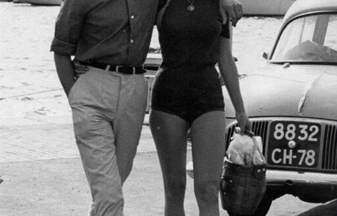 Zdjęcie przedstawia francuską ikonę kina Brigitte Bardot z jej ówczesnym mężem, aktorem Jacques’em Charrierem . Łączą w sobie swobodną chwilę, która łączy w sobie naturalność i elegancję, odzwierciedlając spontaniczną bliskość i ponadczasowy urok.