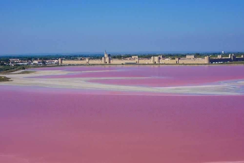 Błękitne jeziora można znaleźć w Karelii, Chorwacji lub Kanadzie. Ale żeby zobaczyć różowe jezioro, trzeba pojechać do Francji. Najsłynniejsze znajduje się w małym prowansalskim miasteczku Aigues-Mortes. Niezwykły kolor wody najlepiej podziwiać z murów starożytnej fortecy położonej tuż nad jeziorem.