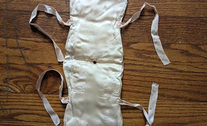 W tym konkretnym przypadku zdjęcie przedstawiało dość zagadkowy dodatek: miękką, pikowaną satynę ozdobioną małymi kokardkami po bokach. Żadnych guzików, widocznych zapięć, żadnych oznaczeń. Na pierwszy rzut oka nie sposób było określić jej przeznaczenia. Czy była niekompletna? Źle przechowywana? Używana niezgodnie z przeznaczeniem?