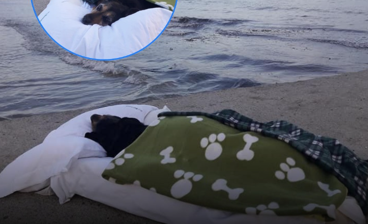 O świcie na włoskiej plaży mężczyzna położył poduszkę na piasku i otulił swojego starego psa kocem z nadrukowanymi kośćmi.