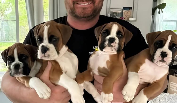 Cztery małe, drżące kulki futra – boksery, ledwie trzymające się na łapach. Bez wahania zatrzymałem auto. Pieski wyglądały na głodne i przestraszone, ale jedno natychmiast przykuło moją uwagę – miało żółtą obrożę.