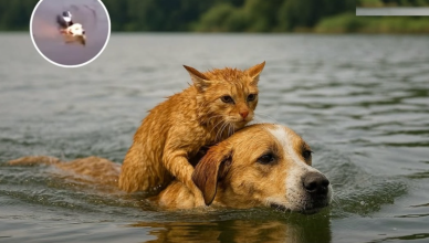 Odważny pies wskoczył do rzeki, aby uratować kota walczącego o utrzymanie się na powierzchni. Bez wahania przepłynął przez silne prądy, aby dotrzeć do