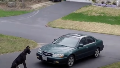 Dog niemiecki zatrzymuje właściciela na podjeździe, by złożyć mu najsłodsze „specjalne pozdrowienia”